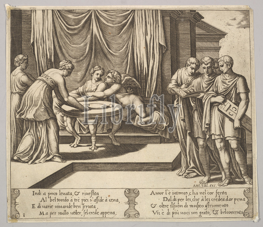 Plate 8: Psyche seated at a table and attended by invisible servants, Eros beside the goddess, from 'The Fable of Cupid and Psyche.', 1530–60, Engraving, sheet: 7 11/16 x 8 7/8 in. (19.5 x 22.5 cm), Prints, Master of the Die (Italian, active Rome, ca. 1530–60), After Michiel Coxie (I) (Netherlandish, Mechelen ca. 1499–1592 Mechelen)