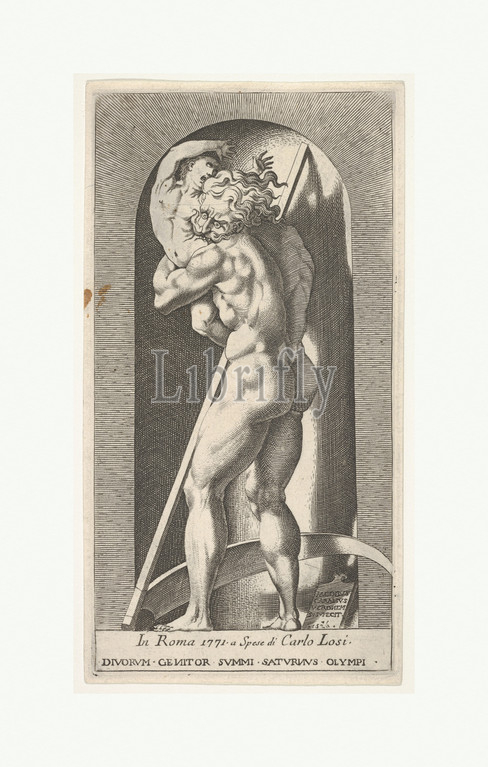 Plate 1: Saturn in a niche devouring his son, standing before a scythe, from a series of mythological gods and goddesses, 1526, Engraving, sheet: 8 11/16 x 4 5/8 in. (22.1 x 11.7 cm), Prints, Giovanni Jacopo Caraglio (Italian, Parma or Verona ca. 1500/1505–1565 Krakow (?)), After Rosso Fiorentino (Italian, Florence 1494–1540 Fontainebleau)