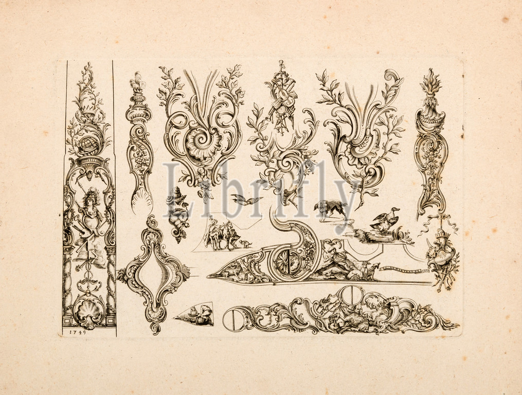 Plate Six from Nouveavx Desseins D’Arquebvseries, dated 1749, French, Engraving, sheet: 11 7/8 x 9 in. (30.16 x 22.86 cm); plate: 9 1/8 x 6 3/8 in. (23.17 x 16.19 cm), Works on Paper-Engravings, The pattern book to which this plate belongs was among the most influential means by which the French fashion of firearms ornament spread throughout Europe and remained the leading style throughout the eighteenth century