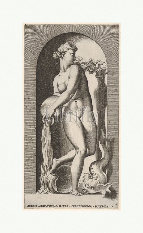 Plate 6: Thetis standing in a niche with a shell and sea creature, pouring water out of a vase, looking to her left, from a series of mythological gods and goddesses, 1526, Engraving, sheet: 8 1/4 x 4 1/4 in. (20.9 x 10.8 cm), Prints, Giovanni Jacopo Caraglio (Italian, Parma or Verona ca. 1500/1505–1565 Krakow (?)), After Rosso Fiorentino (Italian, Florence 1494–1540 Fontainebleau)