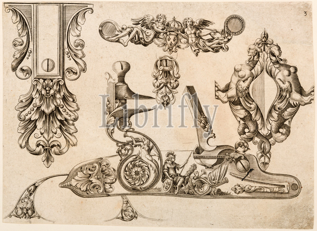 Plate Three, Plusieurs Models des plus nouuelles manieres qui sont en usage l, ca, 1660, Paris, French, Engraving, sheet, 7 x 5 1/8, 17.8 13 cm, Works, Paper-Engravings, Little, royal gunmakers, Thuraine, Le Hollandois, published, pattern book, sheet comes, remains, rare, important document, Parisian gunmaking, leading style, firearms ornament early, reign, Louis XIV