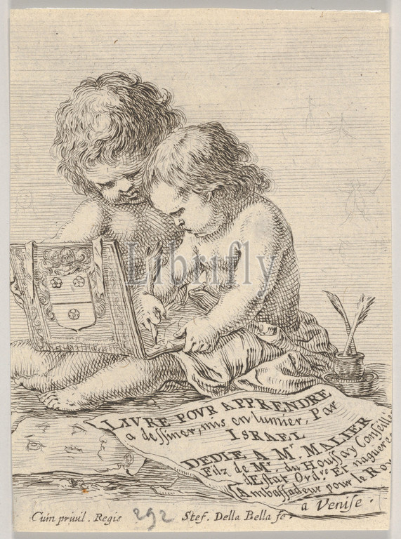 Plate 1, two children sitting, ground, child, right drawing, left holding, album, title page, Book, Learning, Draw, Livre pour apprendre à dessiner, ca, 1649, Etching, Sheet, 3 5/16 x 2 3/8, 8.4 6.1 cm, Prints, Stefano della Bella, Italian, Florence, 1610–1664