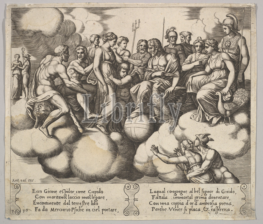 Plate 30, Venus, Cupid pleading, case, presence, Jupiter, Gods, Fable, Psyche, 1530–60, Engraving, sheet, 7 11/16 x 8 7/8, 19.5 22.5 cm, Prints, Master of the Die, Italian, active Rome, ca., After Michiel Coxie, I, Netherlandish, Mechelen ca., 1499–1592, Mechelen