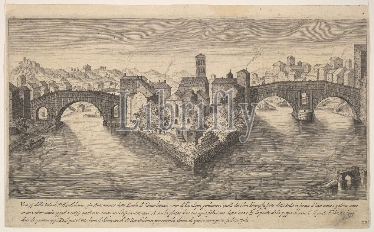 Plate 37, view, church, San Bartolomeo, Isola, Tiber Island, Rome, flanked, bridges, series, Ruins, antiquity, Tivoli, Pozzuoli, places, Vestigi della antichità di Roma, Pozzvolo et altri luochi, 1606, Etching, engraving, Sheet, 6 13/16 x 11, 17.3 28 cm, Aegidius Sadeler II, Netherlandish, Antwerp, 1568–1629, Prague, After Etienne DuPérac, French, ca., 1535–1604