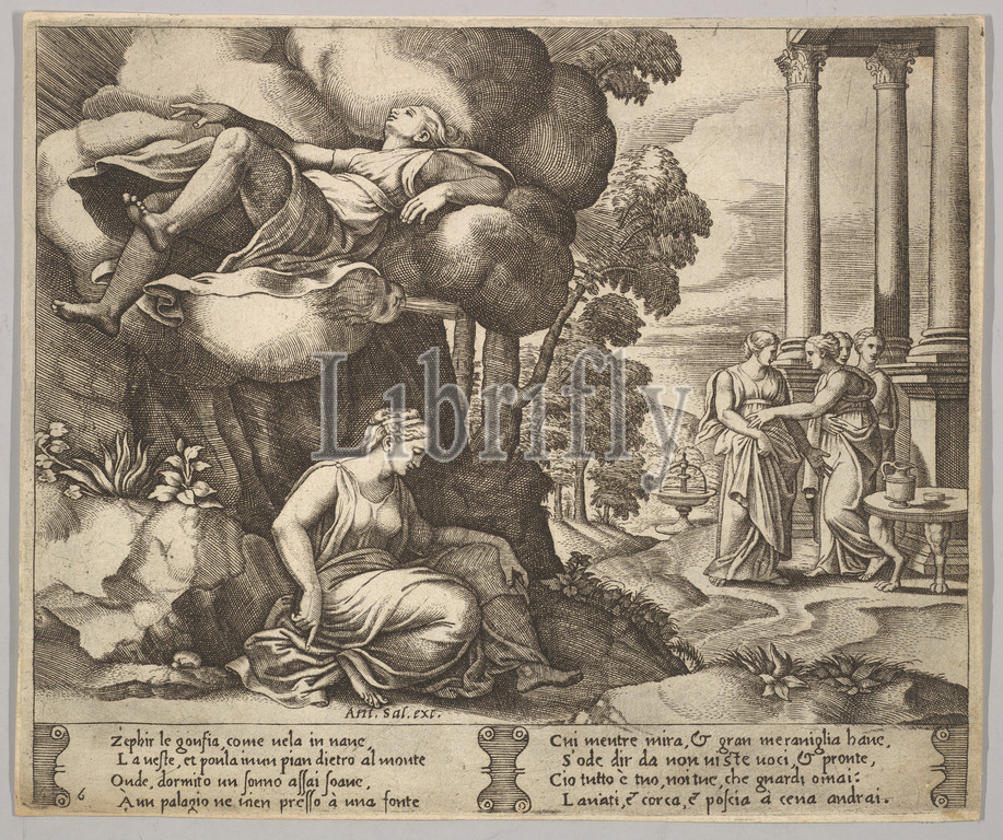 Plate 6: Zephir carrying off Psyche to an enchanted palace, from 'The Fable of Psyche', 1530–60, Engraving, sheet: 7 11/16 x 8 7/8 in. (19.5 x 22.5 cm), Prints, Master of the Die (Italian, active Rome, ca. 1530–60), After Michiel Coxie (I) (Netherlandish, Mechelen ca. 1499–1592 Mechelen)