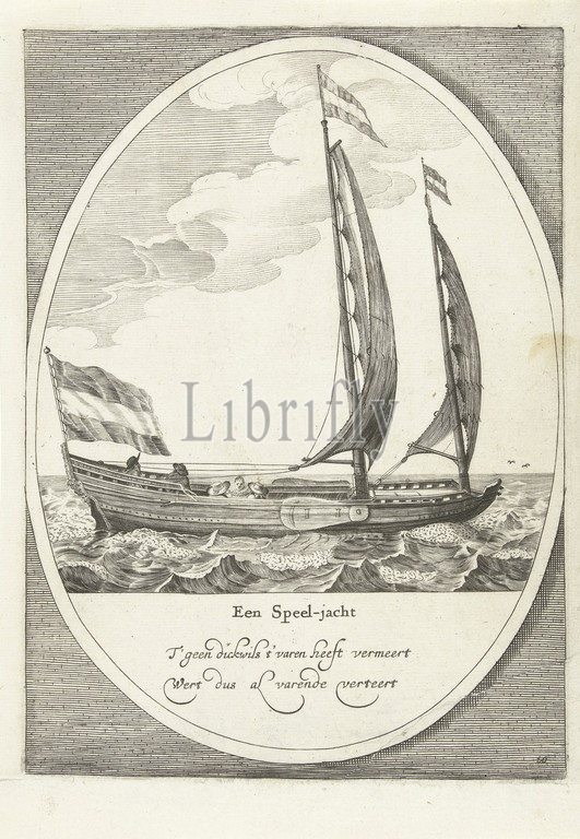 A play yacht, 1642 A Play yacht (title on object) Ten different Dutch types of inland vessels (series title), in oval, to the right, 1642. With two-line Dutch verse. Sheet No. 10 in a series of ten different Dutch types of inland vessels, ships (in general) (propulsion of vehicle, ship, etc. by wind), Dirk Eversen Lons, Northern Netherlands, 1642, paper, engraving, h 130 mm × w 165 mm