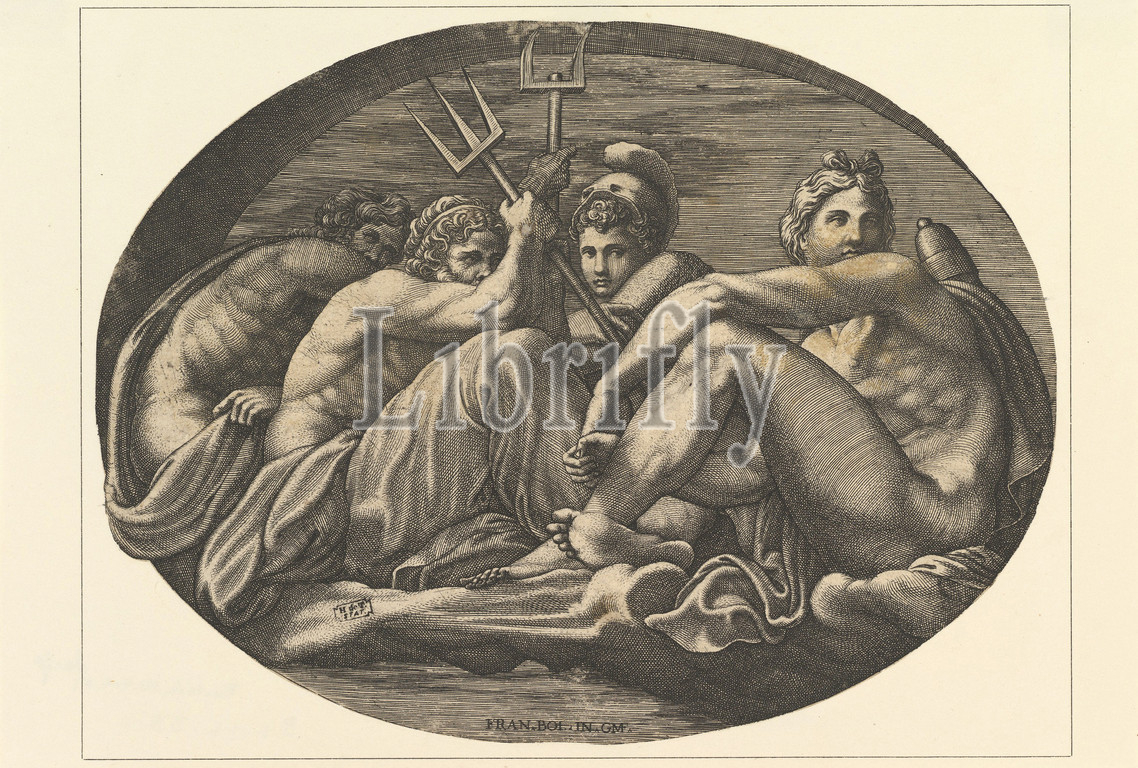 Pluto, Neptune, Minerva, Apollo, series, eight compositions, Francesco Primaticcio, designs, ceiling, Ulysses Gallery, destroyed 1738-39, Fontainebleau, 1560s, Engraving, sheet, 6 15/16 x 9 1/4, 17.7 23.5 cm, trimmed, oval, laid down, Prints, Giorgio Ghisi, Italian, Mantua ca., 1520–1582, Mantua, After Francesco, Bologna, 1504/5–1570, Paris