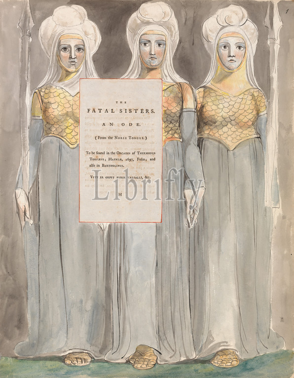 Poems, Thomas Gray, Design 67, Fatal Sisters, William Blake, 1757–1827, British, 1797, 1798, Watercolor, pen, black ink, graphite, moderately thick, slightly textured, cream wove paper, inlaid letterpress page, Sheet, angel, armor, dresses, feathers, gloves, gown, helmets, joust, knights, literary theme, religious, mythological subject, scales, sky, soldiers, spear, text, wings, women