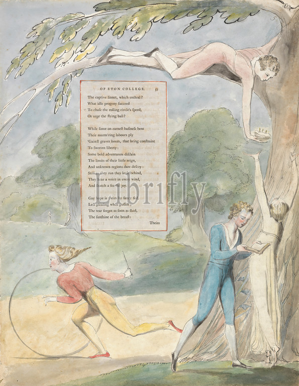 Poems, Thomas Gray, Design 17, Ode, Distant Prospect, Eton College, William Blake, 1757–1827, British, 1797, 1798, Watercolor, pen, black ink, graphite, moderately thick, slightly textured, cream wove paper, inlaid letterpress page, Sheet, ball, bat, birds, boys, cave, girls, hat, hoop, literary theme, men, monsters, nest, animal architecture, night, serpent, stick, text, trees, wings, women, Berkshire, England, Eton College, United Kingdom, Windsor