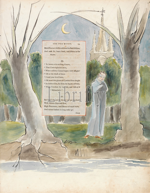 Poems, Thomas Gray, Design 97, Ode, Music, William Blake, 1757–1827, British, 1797, 1798, Watercolor, pen, black ink, graphite, moderately thick, slightly textured, cream wove paper, inlaid letterpress page, Sheet, beards, branches, castle, church, crescent moons, crown, costume component, dead, flowers, plants, leaf, literary theme, men, moon, night, religious, mythological subject, shore, landform, spires, stream, text, trees, trunks, woman
