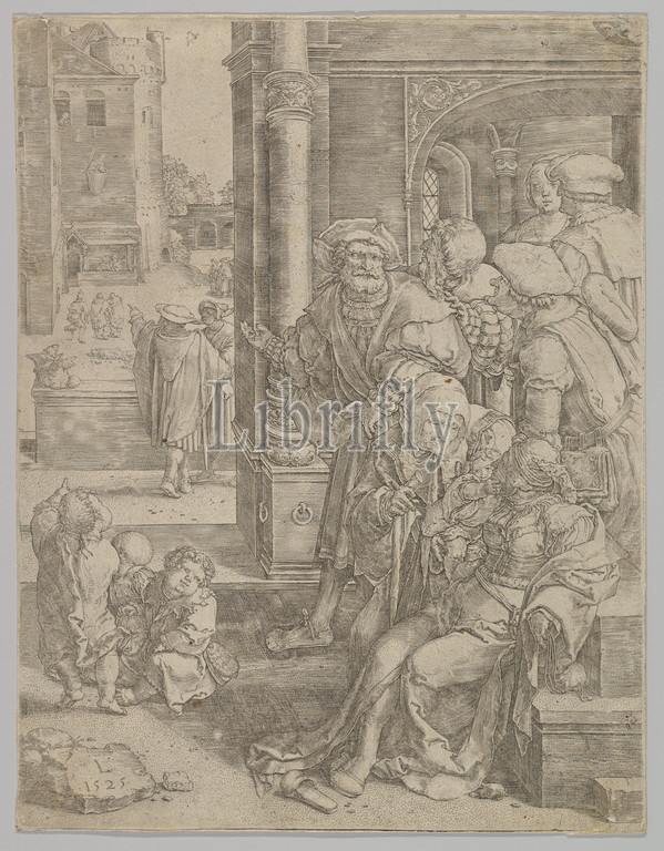 Poet Virgil Suspended, Basket, 1525, Engraving, third state, sheet, 6 1/2 x 7 3/8, 16.5 18.7 cm, Prints, Lucas van Leyden, Netherlandish, Leiden ca., 1494–1533, Leiden