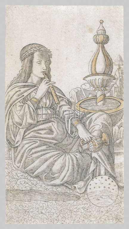 Poetry, ca, 1465–67, Engraving, Image, 6 9/16 x 3 1/2, 16.6 8.9 cm, Prints, Anonymous, Italian, Ferrarese, 15th century, fifty, engravings, Tarocchi di, Mantegna, designed, Mantuan artist, Andrea, do, form, true tarot, deck, lack suits, number cards, face, intended, didactic game, booklet, series, images illustrates, hierarchy, universe, lowly beggar, celestial spheres
