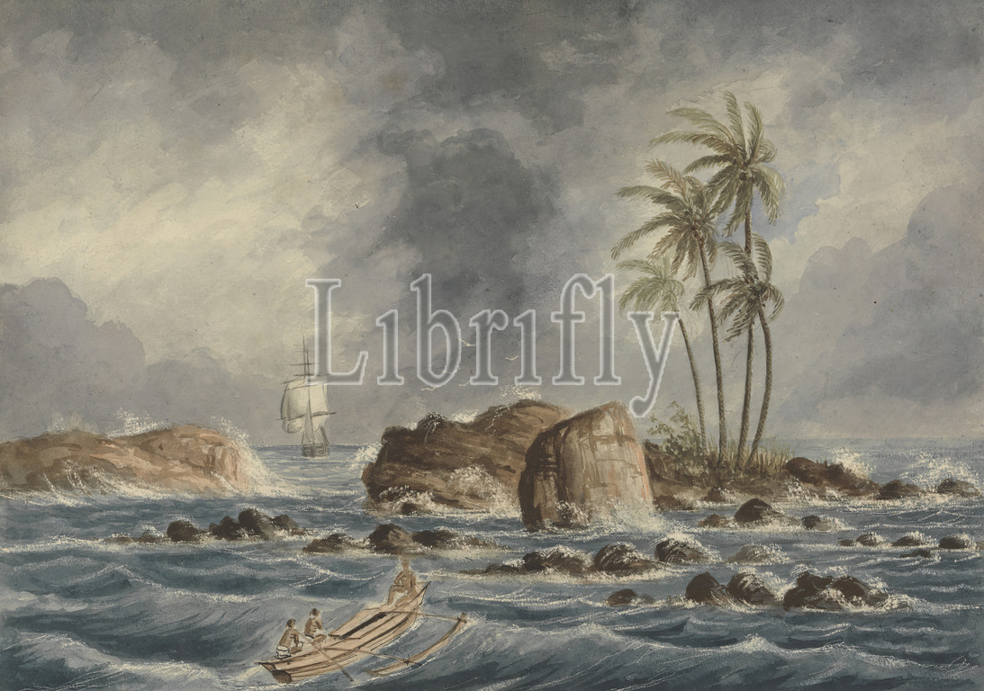 Point de Galle, Ceylon, Sri Lanka, Charles Dyce, active 1848, British, ca, 1849, Watercolor, graphite, scraping out, medium, slightly textured, cream wove paper, Sheet, boat, marine art, men, palm trees, rocks, landforms, ship, storm, waves, natural events, Asia, Ceylon, Point de Galle, Sri Lanka