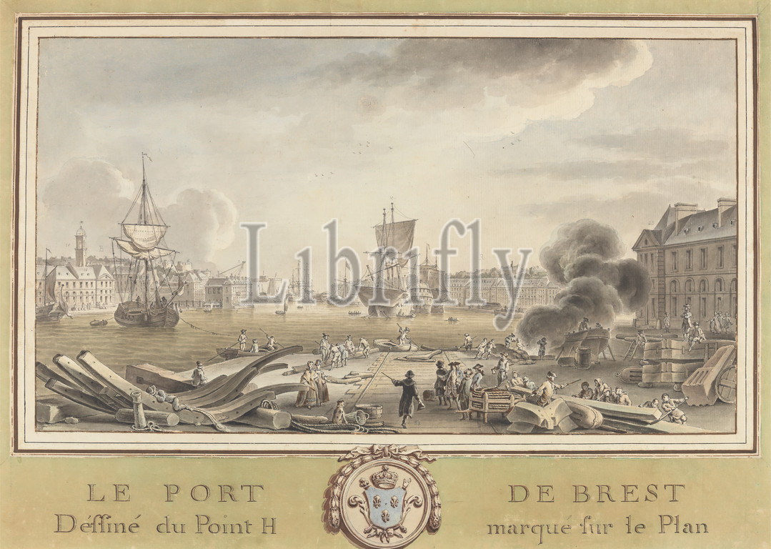 Le Pont de Brest, Definne du Point H, Marque fur la Plan, Dock Scene, Laborers employed, Various Aspects, Ship Construction, Watercolor, pen, black ink, medium, slightly textured, cream laid paper, Sheet, Mount