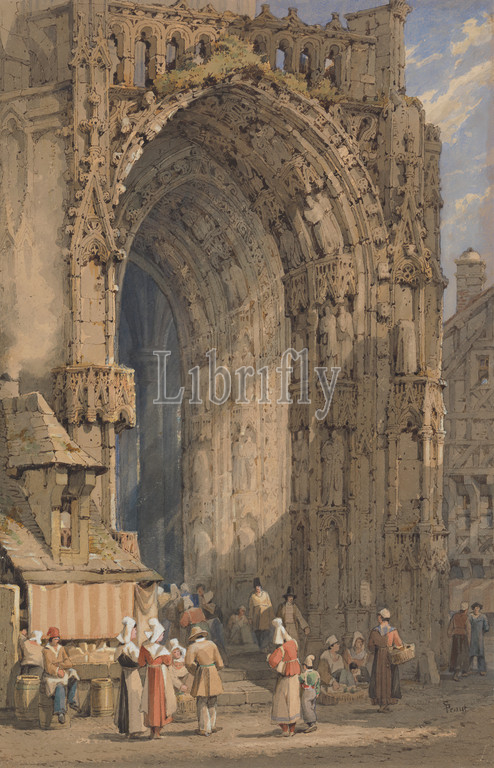 Porch, Reims Cathedral, Samuel Prout, 1783–1852, British, ca, 1840, Watercolor, pen, brown ink, gouache, graphite, scratching out, moderately thick, rough, beige wove paper, Sheet, aprons, main garments, arch, architectural subject, barrels, containers, baskets, bonnets, buildings, cathedral, children, cityscape, dresses, genre subject, kiosks, market, event, men, merchants, niches, porch, portal, relief, sculpture, selling, statues, steps, sunlight, vendors, women, Champagne-Ardenne, France, Marne, Notre-Dame de Reims, Reims