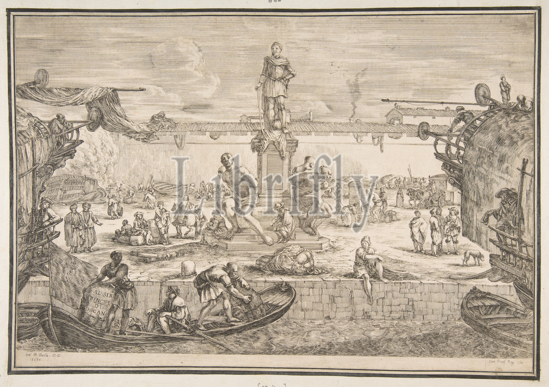 Port, Livorno, Statue, Ferdinand I, Views, port, Vues du port de Livourne, 1655, Etching, first state, two, Sheet, 10 1/8, 14 5/8, 25.7, 37.2 cm, Prints, Stefano della Bella, Italian, Florence, 1610–1664