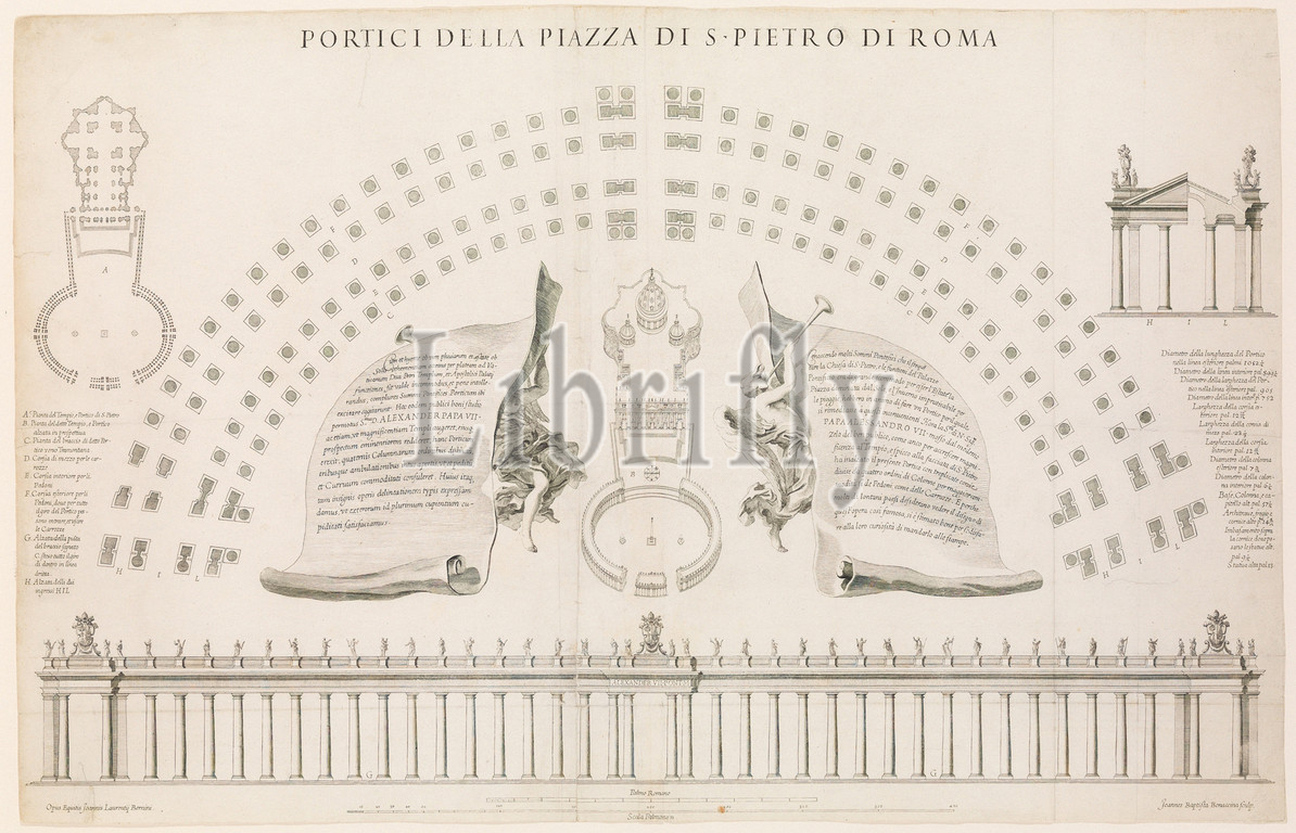 Portici della piazza di S, Pietro Roma, Plate 44, Album, Basilica, Pietro, Vaticano, ca, 1656–67, Engraving, Sheet, 21 5/16 x 33 3/16, 54.2 84.3 cm, Giovanni Battista Bonacina, Italian, Milan, 1620–ca., 1670, After Gian Lorenzo Bernini, Naples, 1598–1680, Rome, Floor plans, aerial view, frontal, arcade, front, Saint Peter, Basilica, concerns, earlier, executed, stage, plans, square, almost, closed off, completely, third part, far side