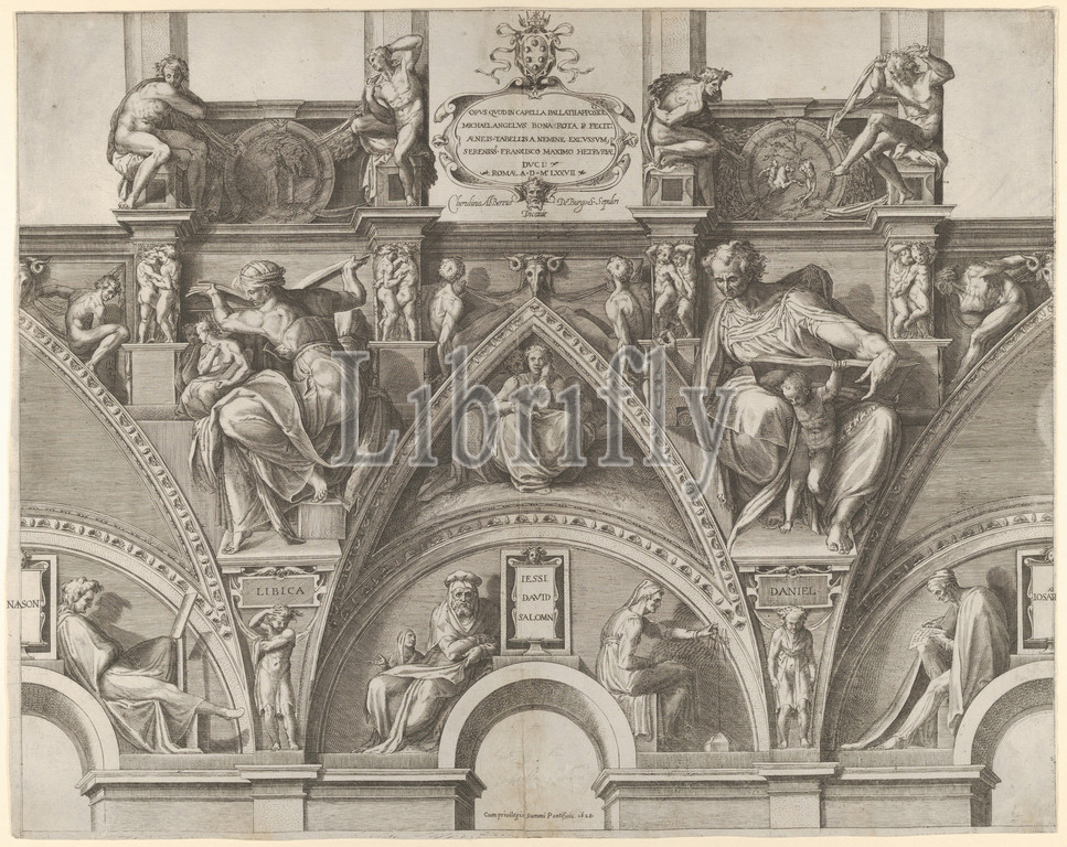 Portion, Ceiling, Sistine Chapel, Libyan Sibyl, Prophet Daniel, Jesse, David, Solomon, Sibyls, Prophets, Chapel Vaults, 1577, republished, 1628, Engraving, Sheet, 17 1/8, 21 5/8, 43.5, 54.9 cm, Prints, Cherubino Alberti, Zaccaria Mattia, Italian, Borgo Sansepolcro, 1553–1615, Rome, After Michelangelo Buonarroti, Caprese, 1475–1564, plate