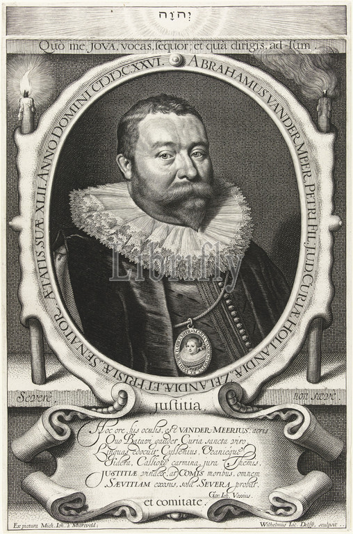 Portrait, Abraham van der Meer, age, 42, portrait miniature, wife Maria van den Corput, 23, Counselor Abraham van der Meer, wears, medallion, miniature portrait, chain, Brisket dressed, pleated collar, gown, oval cartouche flanked, burning, extinguished candle, portrait, cartouche, Latin verse, six lines, Hebrew name, God, printed, radiant light, separate narrow plate, rays continue, upper edge, plate, Vanitas' symbols, tetragram, Roman, Hebrew script, symbol, Father, neck-gear, collar, men's clothes, Maria van den Corput, Willem Jacobsz, Delff, mentioned, object, Delft, 1626, paper, engraving