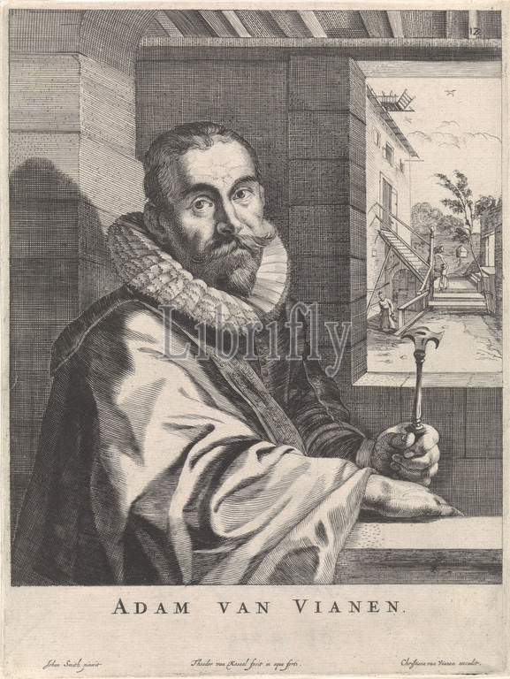 Portrait, Adam van Vianen Adam van Vianen, title, object, Portrait half, right, goldsmith Adam van Vianen, holding, hammer, left hand, window, front, Vianen, sitting, portrait, self-portrait, artist, Adam van Vianen, I, Theodorus van Kessel, mentioned, 1630, 1660, paper, engraving