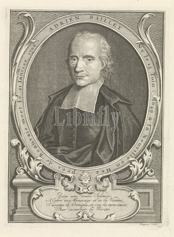 Portrait, Adrien Baillet, Bust portrait, French scholar Adrien Baillet, portrait, framed, oval frame, inscription, French, cartouche, four-line poem, Dirk Jongman, mentioned, object, Amsterdam, 1709, 1726, paper, engraving