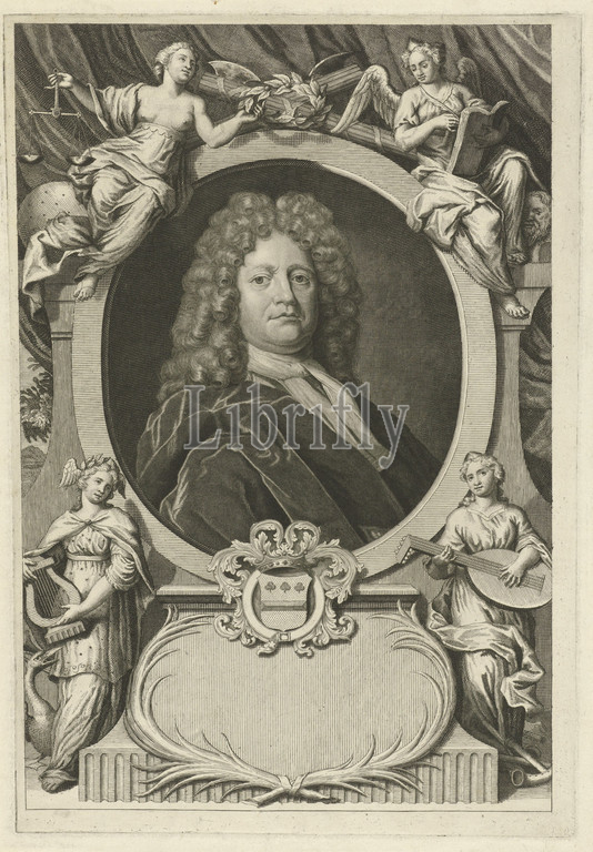 Portrait, Alexander de Muncq, age, 55, mayor, Middelburg, poet, portrait, coat, arms, personifications, Justice, Truth, crown, laurel wreath, Under, portrait two muses play, lyre, zither, Verità, Ripa, Forza alla giustitia sottoposta, Giustitia, Giustitia retta, Giustitia rigorosa, Impietà viviza soggetta alla giustitia, harp, dulcimer, music, musician, instrument, Pieter van Gunst, mentioned, object, Amsterdam, 1710, paper, engraving