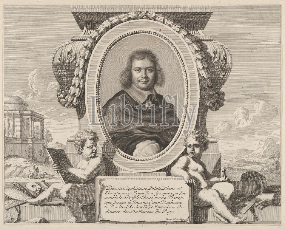 Portrait, Antoine Lepautre, Les Oeuvres d'architecture d'Anthoine Le Paultre, Architecte ordinaire du Roy, ca, 1653, Engraving, second state, four, Petitjean & Wickert, Sheet, 9 15/16, 11, 25.2, 30.4 cm, Prints, Robert Nanteuil, French, Reims, 1623–1678, Paris