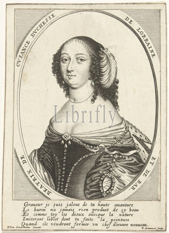 Portrait, Béatrix Cusance, Duchess, Lorraine, oval, dressed, dress, low open neck, feather, head, lower margin French verse, five lines, Bé atrix Cusance, Peter Dannoot, mentioned, object, Antwerp, 1644, 1692, paper, engraving