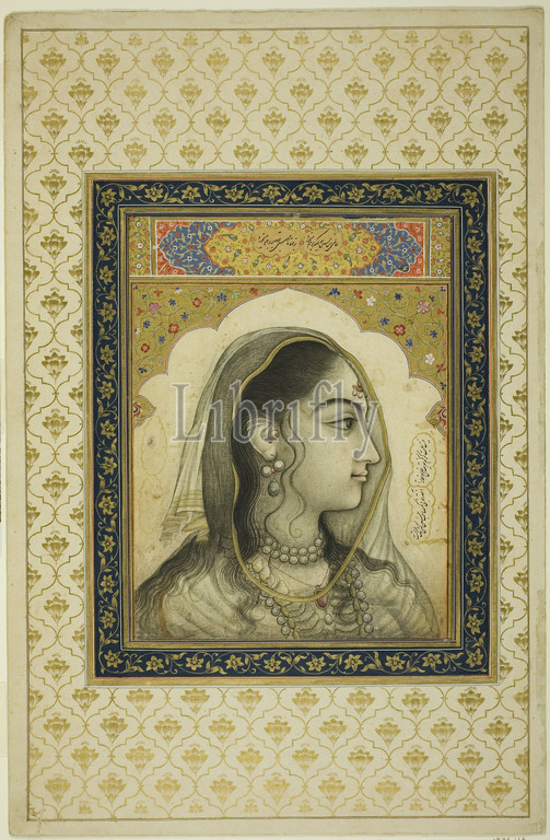 Portrait of a Beauty, 17th century, India, India, Opaque watercolor and gold on paper, Image: 22.4 x 16.6 cm (8 13/16 x 6 1/2 in.), Outermost Border: 41.8 x 26.7 (16 3/8 x 10 1/2 in.), Paper: 44 x 28.6 cm (17 3/8 x 11 1/4 in.)