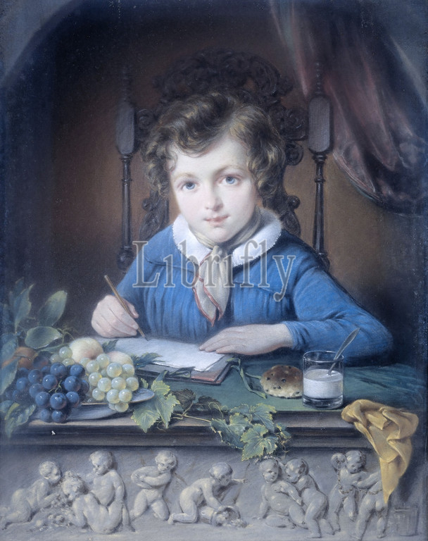 Portrait, boy sitting, window niche, dressed, blue jacket, chair, Writing, drawing, sruk paper, frame, bowl, fruit, vines, glass, milk, currant bun, stone window, adorned, relief, playing, bacchanal, putti, historical persons, name, boy, child, toddler, youth, handwriting, written text, Jean Augustin Daiwaille, attributed, 1830, 1850, paper, cardboard