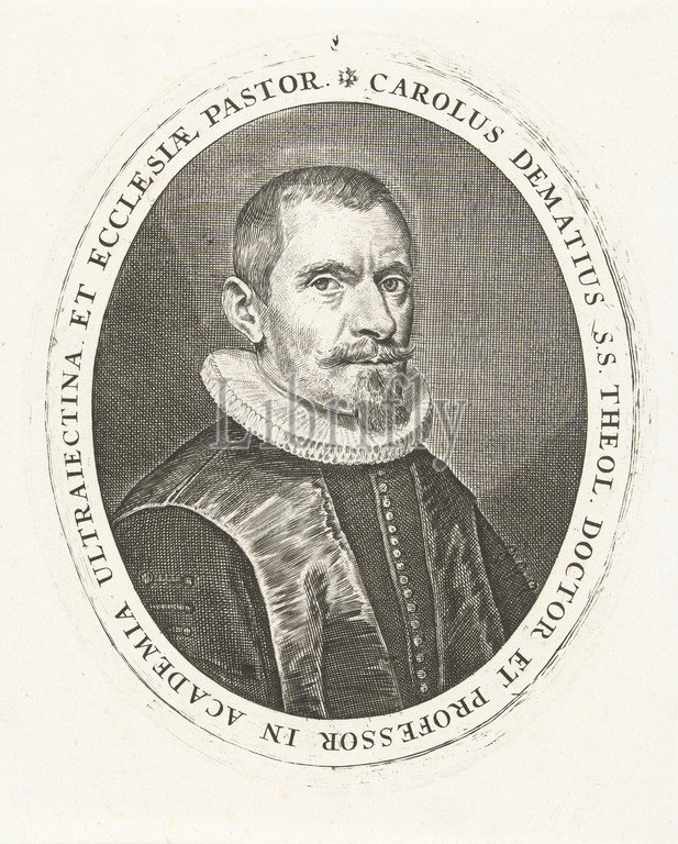 Portrait, Carolus Dematius, age, 46, theologian Carolus Dematius, bust, pleated collar, gown, oval frame, Latin inscription, theologian, neck gear, collar, men's clothes, Willem Jacobsz, Delff, rejected attribution, Delft, 1642, paper, engraving