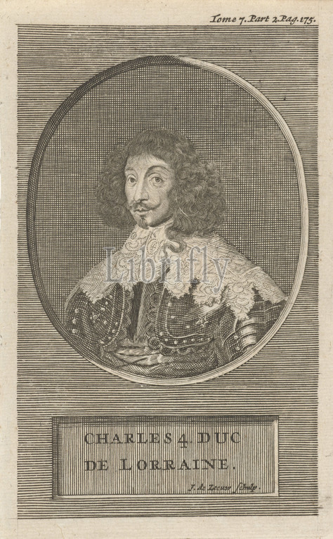 Portrait, Charles V Leopold, Duke, Lorraine, Portrait bust, oval, left, bareheaded, dressed, armor, portrait, name, person portrayed, written, plaque, Print, top right, Tome 7, Part 2, Pag, 175, Jan de Leeuw, mentioned, object, 1704, paper, engraving