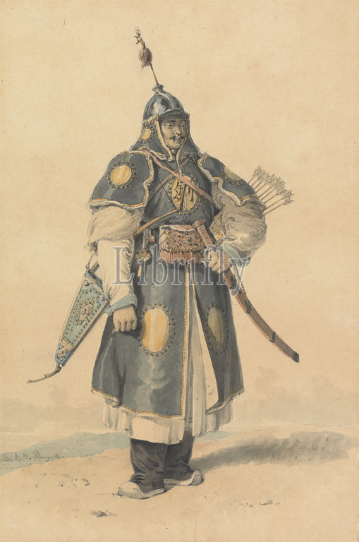 Portrait, Chinese Soldier, William Alexander, 1767–1816, British, Watercolor, graphite, medium, slightly textured, beige wove paper mounted, card, Mount, Sheet, armed forces, armor, arrows, Chinese, costume, figure study, helmet, hilt, man, military uniform, quiver, soldier, sword, China