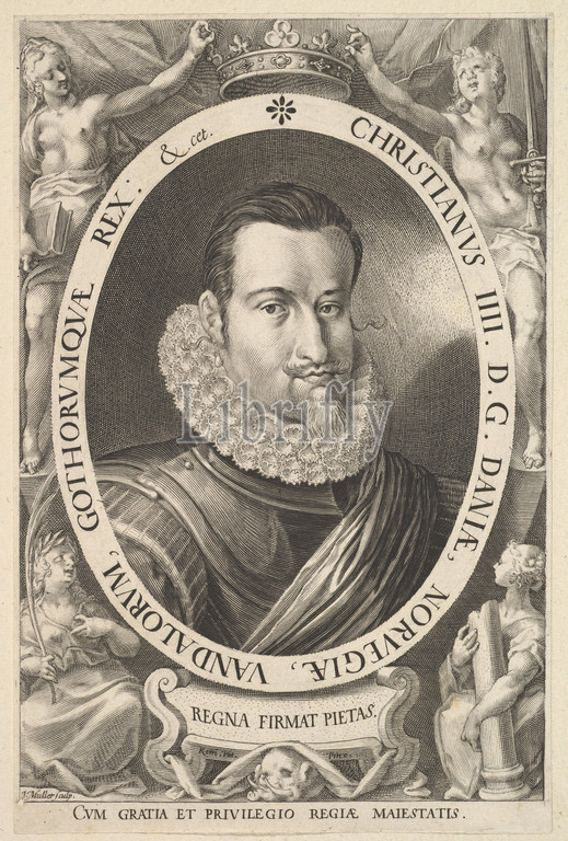 Portrait of Christian IV, King of Denmark, in Decorated Oval, ca. 1606, Engraving; third state of three, 7 5/16 × 4 13/16 in. (18.6 × 12.2 cm), Prints, Remmert Petersen, Jan Muller (Netherlandish, Amsterdam 1571–1628 Amsterdam)