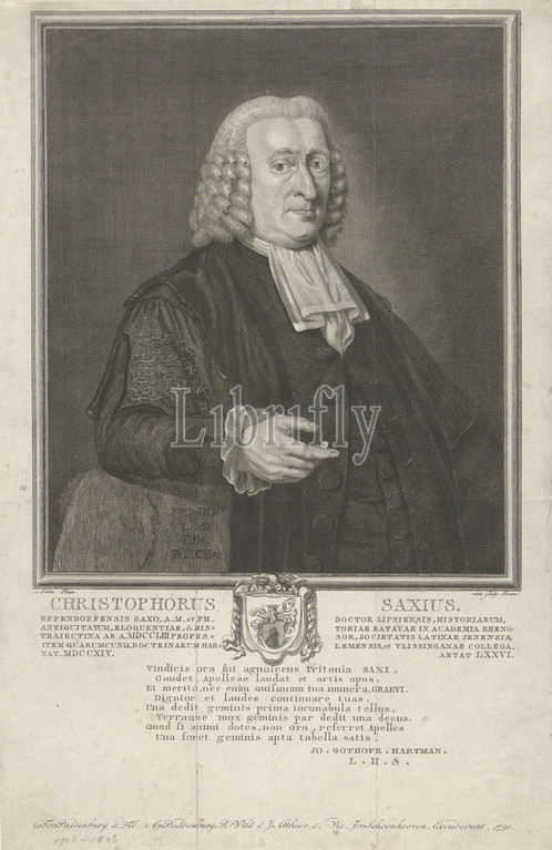 Portrait, Christophorus Saxius, professor Christophorus Saxius, half-length, wears, gown, leans, right arm, stone, inscription, Latin, margin, coat, arms, person portrayed, ten-line caption, two columns, eight-line poem, Pieter Hendrik Jonxis, mentioned, object, Utrecht, 1790, paper, engraving