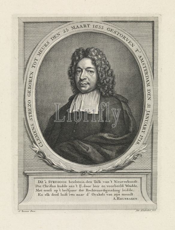 Portrait of Clemens Streso, Half-length portrait to the left of Clemens Streso in an oval medallion, with laurel branches at the bottom and with border lettering in Dutch. The portrait rests on a pedestal on which a four-line verse in Dutch, Clemens Streso, Jacob Houbraken (mentioned on object), Amsterdam, 1718 - 1780, paper, engraving, h 206 mm × w 153 mm