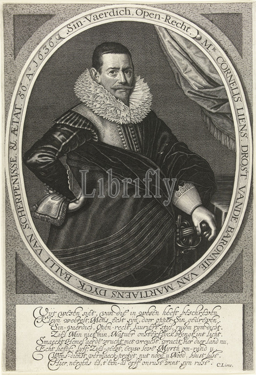 Portrait, Cornelis Liens, age, 56, standing half-length, clothing, suits, status, drost, bailiff, Oval frame, Dutch verse, eight lines, Bailiff, Willem Jacobsz, Delff, Delft, 1636, paper, engraving