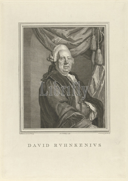 Portrait of David Ruhnken, Portrait of the philologist David Ruhnken, half-length. He is standing by a curtain and has put his left hand in his gown. In the margin the name of the person portrayed in Latin., David Ruhnken, Pieter Hendrik Jonxis (mentioned on object), Utrecht, 1792, paper, engraving, h 370 mm × w 263 mm