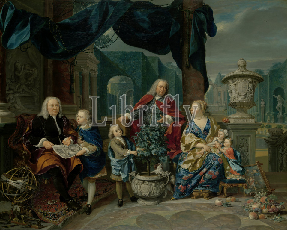 Portrait of David van Mollem with his Family, Portrait of David van Mollem with his family, Portrait of David van Mollem (1670-1746) and Jacob Sydervelt with his family in 1740. The company is located at the terrace of the Zijdebalen house. Depicted David van Mollem, Jacob van Sydervelt with his second wife Maria van Oosterwijck and the two children from this marriage as well as the two sons from the first marriage with Jacoba van Mollem (dec. 1735). A boy shows David van Mollem a print, a tree in a pot, a garden vase and a bowl of fruit. On the reverse of the painting are the arms and names of the three families, held together by putti with ribbons, family group, especially parents with their child (ren), print, eg: engraving, etching, lithograph, armillary sphere, skeleton celestial globe, garden vase, David van Mollem, Jacob Sydervelt, Nicolaas Verkolje, 1740, panel, oil paint (paint), h 63.5 cm × w 79 cm