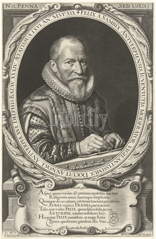 Portrait, Felix van Sambix, age, 66, calligrapher Felix van Sambix, half-length sitting, writing desk, pen, paper, oval frame, inscription, Under portrait cartouche, Latin verse, eight lines, Willem Jacobsz, Delff, mentioned, object, Delft, 1619, engraving