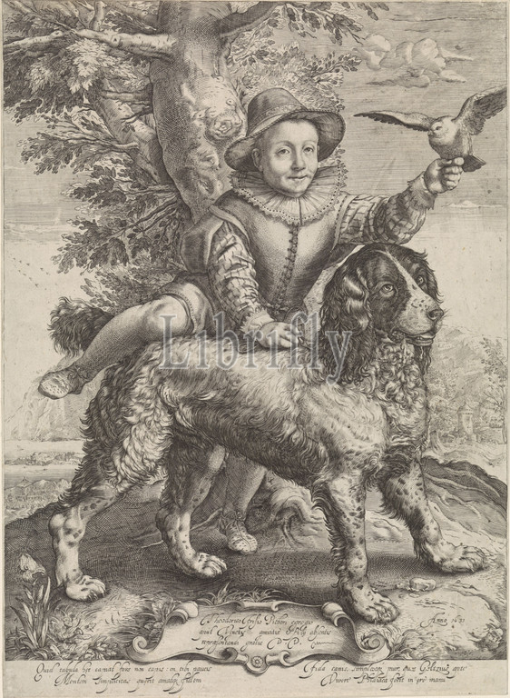 Portrait, Frederik de Vries, dog, Hendrick Goltzius, son, painter Dirck de Vries, student, Frederik gets ready, sit, dog's back, holds, pigeon, hand, assignment, Latin, cartouche, caption, Latin speaks, simplicity, child, loyalty, 1631, paper, engraving