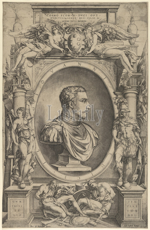 Portrait, Giovanni de, Medici facing right within, elaborate cartouche flanked, Victory, left, Mars, right, winged figures holding Medici coat, arms upper centre, 1550, Engraving, sheet, 18 3/4 x 12 1/16, 47.7 30.7 cm, Prints, Enea Vico, Italian, Parma, 1523–1567, Ferrara