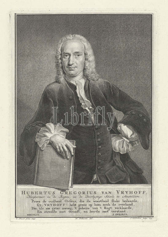 Portrait, Hubertus Gregorius van Vrijhoff, Professor, Law, Athenaeum Illustre, predecessor, University, Amsterdam, resting, arm, book, plinth, front, name, profession, four-line verse, Dutch, Historical persons, Jacob Houbraken, mentioned, object, 1754, 1755, paper, engraving
