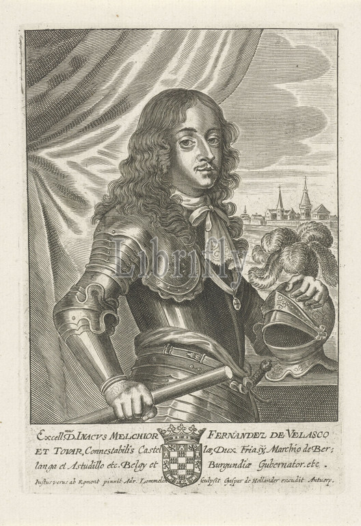 Portrait, Inacho Melchior Ferdinand de Velasco, constable, Velasco, Tovar, governor, Belgium, Burgundy, margin, family crest, person portrayed, Inacho Melchior Ferdinand de, Adriaen Lommelin, mentioned, object, Antwerp, 1652, 1677, paper, engraving