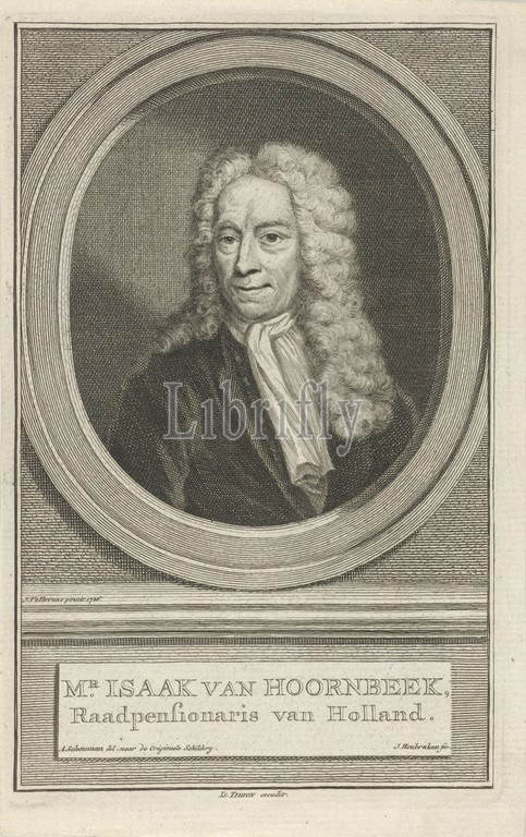 Portrait, Isaac van Hoornbeek Isaak van Hoornbeek, title, object, bust, right, Isaac van Hoornbeek, oval, portrait rests, plinth, name, two lines, Dutch, Jacob Houbraken, mentioned, Amsterdam, 1749, 1759, paper, engraving