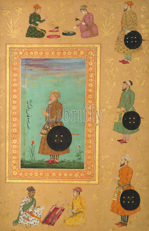 Portrait, Islam Khan Mashhadi, 17th century, India, Opaque watercolor, gold, paper, 15 x 9 13/16in, 38.1 24.9cm, Codices, Payag, Indian, active ca., 1591–1658, Portraits, emperors, families, important figures, collected, imperial albums, Mughal India, work, originally part, Late Shah Jahan, Album, Identified, text, left, Khan, Mashhadi, vizier, served under, emperor, governor, Bengal, Deccan, shown, profile, shield, side