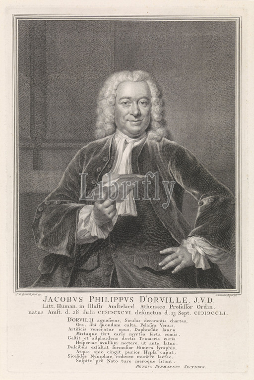 Portrait, Jacobus Philippus d'Orville Jacobvs Philippvs d 'Orville, title, object, Half-length portrait, Jacobus Philippus d'Orville, sheet, paper, right hand, portrait, name, information, three lines, Latin, ten-line text, Jacob Houbraken, mentioned, Amsterdam, 1762, engraving