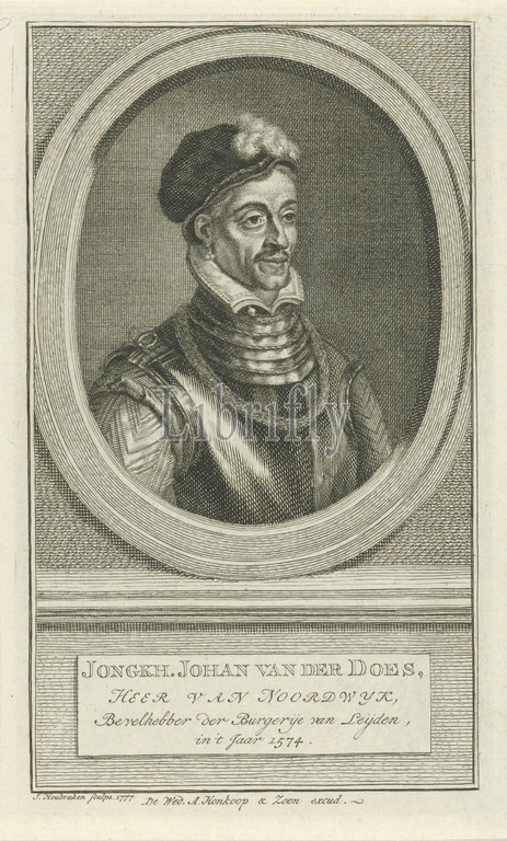 Portrait, Johan van der Does Jongkh, Johan van der Does, title, object, Bust, right, lord, Noordwijk, oval, portrait rests, plinth, name, information, written, four lines, Dutch, Jacob Houbraken, mentioned, Leiden, 1777, paper, engraving