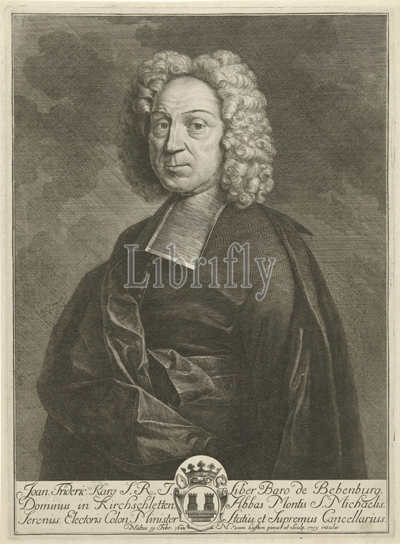 Portrait, Johann Friedrich Karg, Baron van Bebenburg, Johann Friederich Karg, baron van Bebenburg, age, 61, half-length, wig, black robe, white collar, background, clouds, under, three-line text, Latin, family crest, Johann Friedrich Reichsfreiherr Karg von Bebenburg, Nicolaes van Haeften, mentioned, object, Paris, 1709, paper, engraving