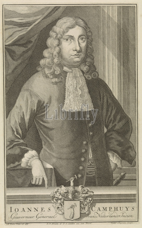 Portrait, Johannes Camphuys, Governor General, Dutch East Indies, half-length, wearing, embroidered collar, holds, left hand, side, leans, table, right hand, plinth, coat, arms, name, position, Dutch, Wouter Jongman, mentioned, object, Amsterdam, 1712, 1744, paper, engraving